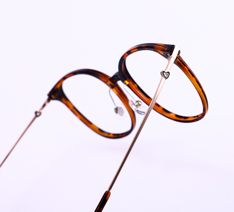Detalhes em forma de coração nas laterais das hastes, adicionando charme divertido.