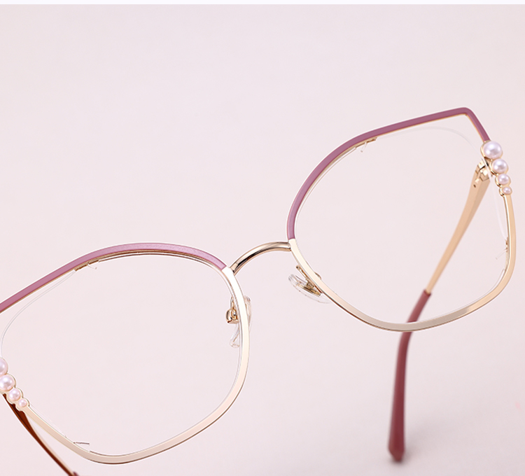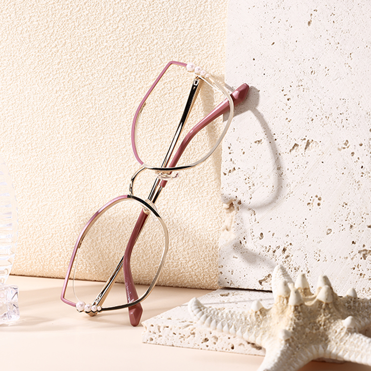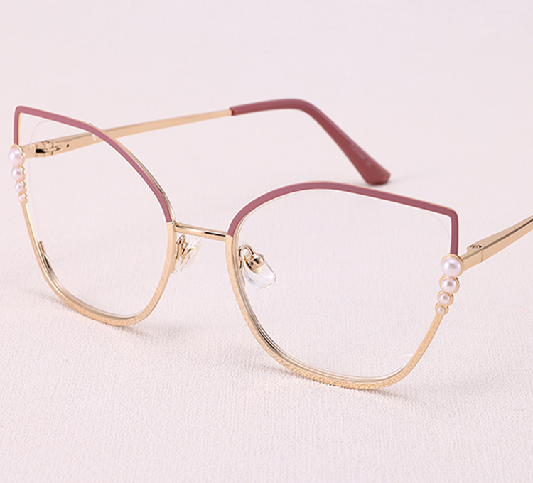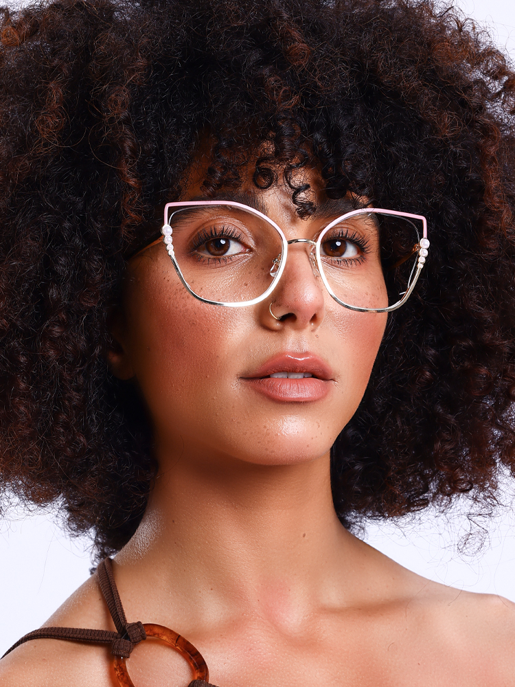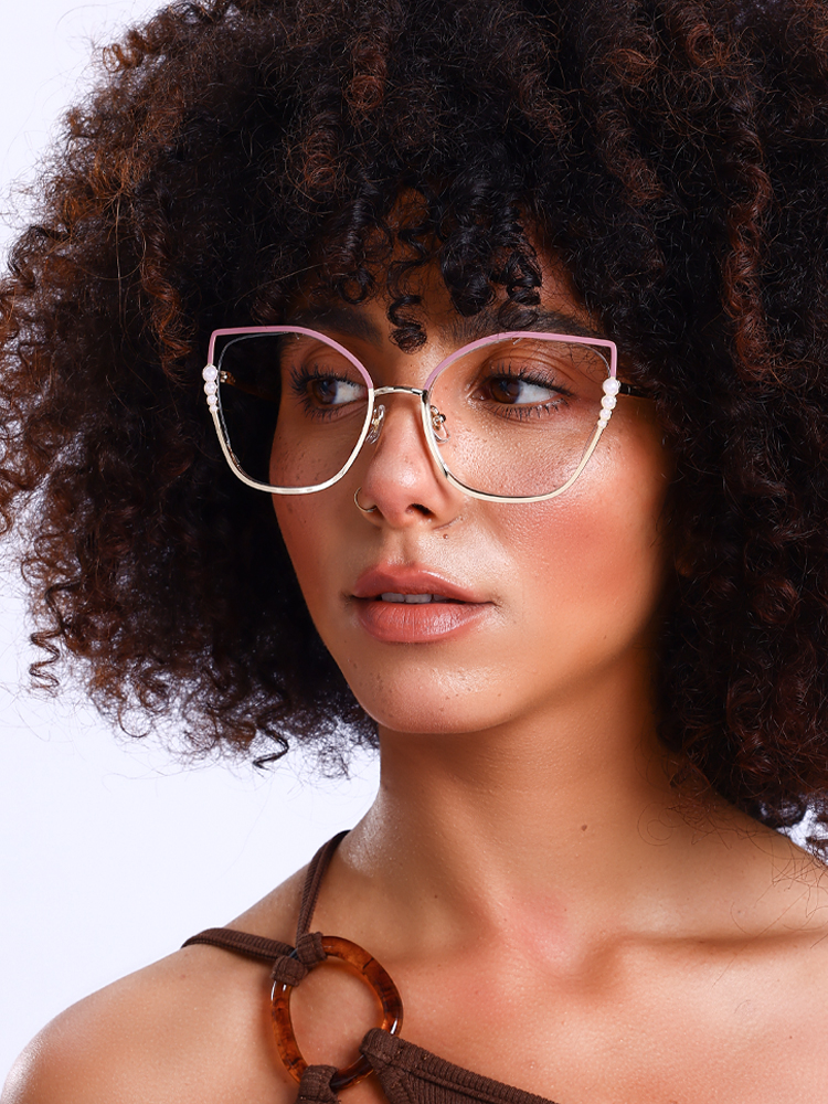 Detalhes em pérola nas laterais do aro frontal adicionam elegância.