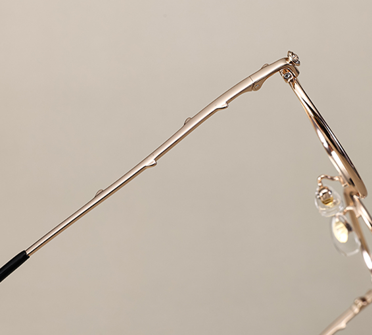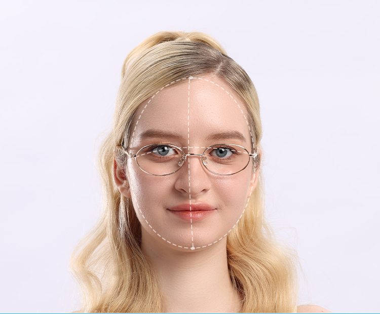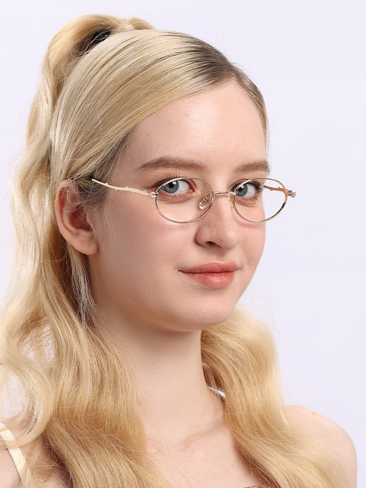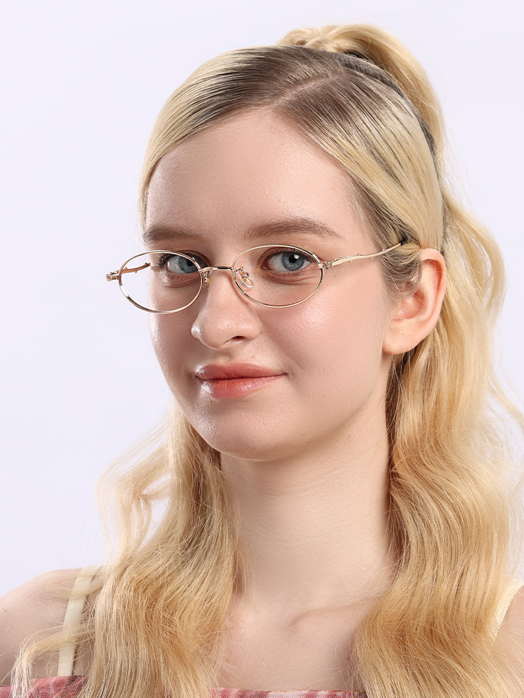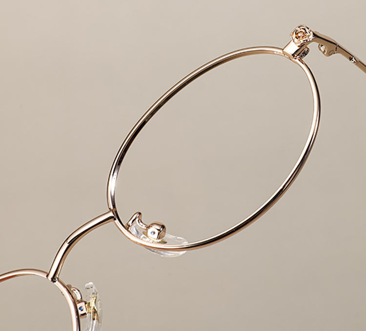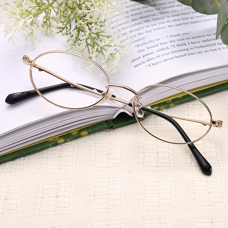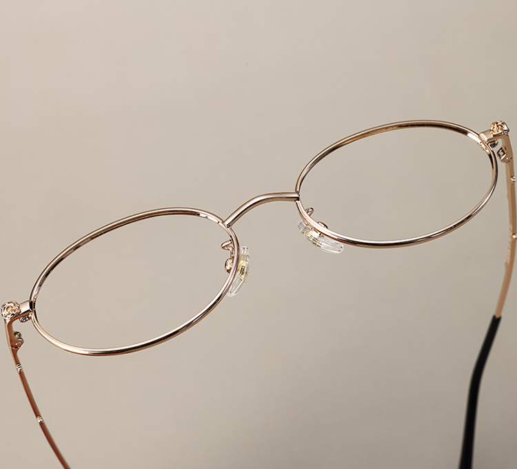 Uma armação metálica delicada e oval com linhas refinadas.